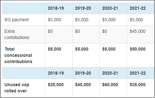 • The five-year carry-forward period started on 1 July 2018 so the 2019-20 financial year is the first one when you can actually make extra concessional contributions using any unused super contribution cap.