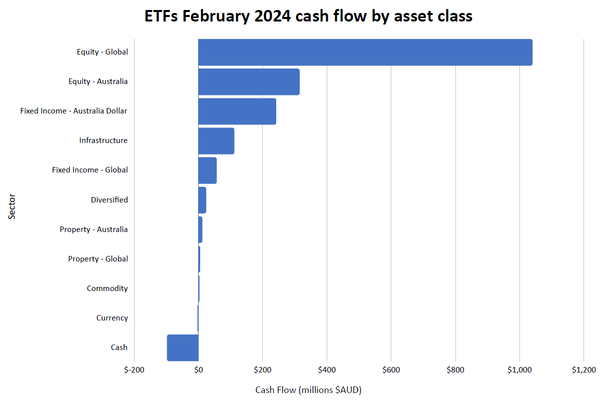 Investors added another $1.72 billion into Australian-listed exchange traded funds (ETFs) in February, bringing total ETF inflows over the first two months of 2024 to $3.5 billion.