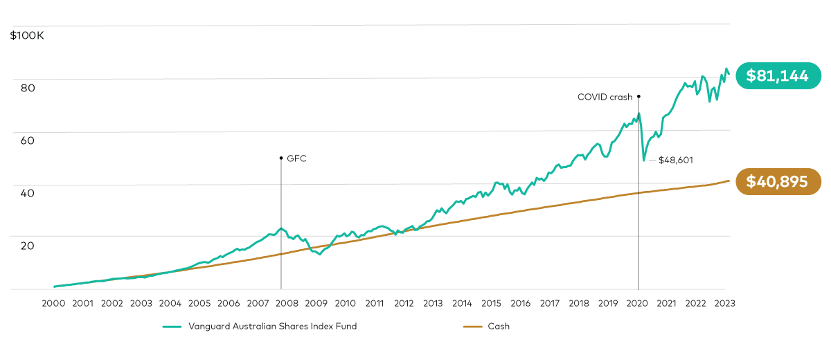Source: Vanguard. Calculations are based on a $1,000 investment into the Vanguard Australian Share Index Fund from 1 January 2000 to 28 February 2023 with additional $100 monthly contributions and the reinvestment of all income distributions. Total returns are before fees and taxes.