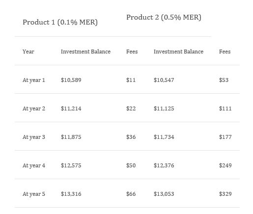 Again, using a $10,000 example and a five-year investment period, a managed fund product with a MER of 0.1% cent that achieves investment earnings of 6% a year would end up costing $66 in fees. At a 0.5% MER, your costs would be $329.