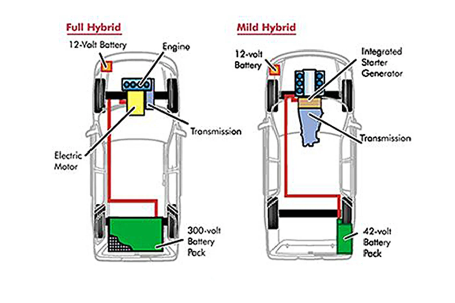 In a typical mild hybrid system, a small electric motor and a 48-volt battery supplement a petrol or diesel engine.
