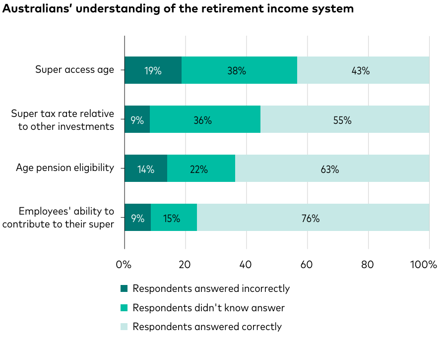 Yet, Vanguard’s 2024 How Australia Retires research shows a high percentage of Australians don’t know the basics, let alone the countless, more complex, super, pension, tax and other regulations that apply to the nation’s almost $4 trillion retirement system.