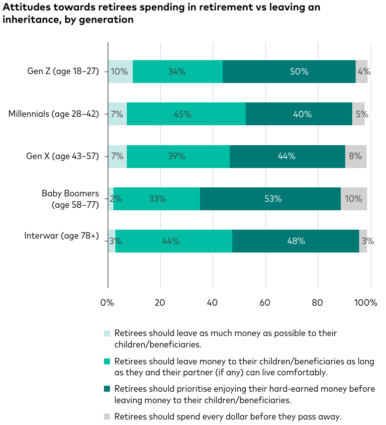 10% of Baby Boomers (aged 58 to 77) in Australia believe retirees should spend all of their money in retirement, while 10% of Gen Z (aged 18 to 27) believe retirees should leave as much money as possible to their children/beneficiaries.